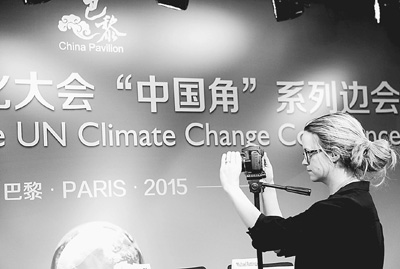 氣候變化巴黎大會期間,各國媒體紛紛聚焦中國角系列活動。圖為一名記者在中國角活動現場拍攝。