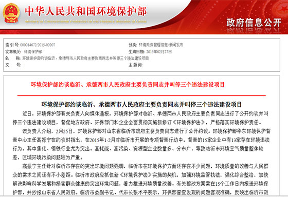環(huán)保部刊發(fā)約談臨沂市長原文:《環(huán)境保護部約談臨沂、承德兩市人民政府主要負責同志并叫停三個違法建設項目》