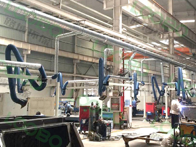 已焊接車間粉塵治理為例:大型的焊接車間工況比之普通的焊接車間要更為復雜,選用中央煙塵凈化系統更為合適。它是通過收集裝置將多個工位產生的煙氣粉塵進行瞬間收集后,經采用漸變管徑式(目的是平衡管路末端風速風量)的主管道進入除塵器,煙塵在除塵器內被PTFE聚酯覆膜濾筒阻截凈化,顆粒物在風機負壓作用下附著在濾件外側,脈沖閥在控制儀的控制下,每隔一定時間,自動對系統濾件由里至外進行反吹清灰,反吹過程中顆粒物落入灰斗內收集(灰斗內積累到一定量的顆粒物后,需要外運處理),凈化達標后的氣體通過風機作用經由煙囪排出。