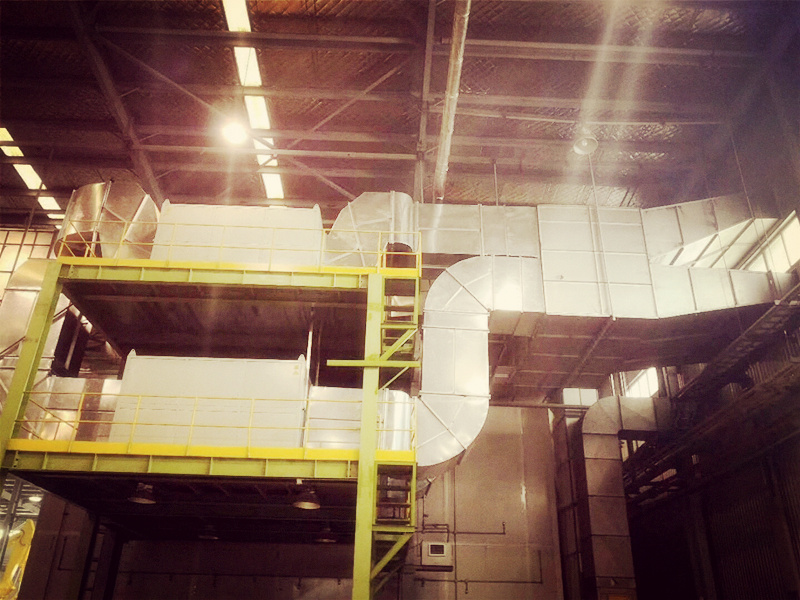 工業廢氣利用排風設備輸入到凈化設備后,凈化設備運用高能UV紫外線光束及臭氧對工業廢氣進行協同分解氧化反應,使工業廢氣降解轉化成低分子化合物、水和二氧化碳,再通過排風管道排出室外。