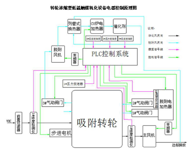 轉(zhuǎn)輪濃縮型低溫觸媒氧化設(shè)備:是采用轉(zhuǎn)輪式吸附床對(duì)有機(jī)廢氣進(jìn)行吸附濃縮,濃縮的有機(jī)廢氣在脫附再生區(qū)被脫附后,被再生風(fēng)機(jī)引入催化燃燒凈化裝置,進(jìn)一步凈化處理。整個(gè)裝置分為VOC濃縮區(qū)和濃縮后VOC凈化處理區(qū)兩大模塊。